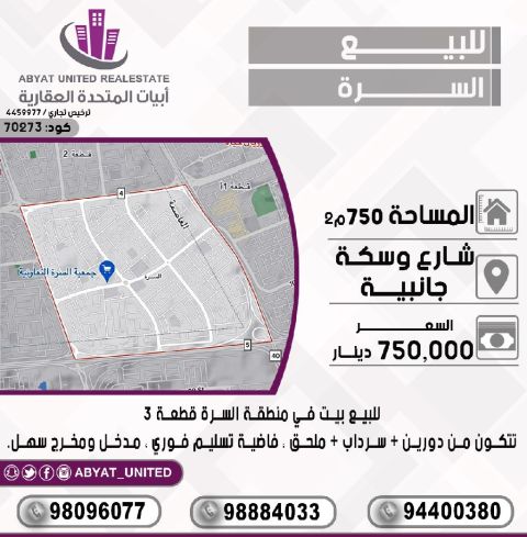 للبيع: بيت في منطقة السرة، قطعة 3. الموقع: شارع وسكة جانبية. المساحة: 750 متر مربع. يتكون من دورين، سرداب، ملحق، وفاضية. تسليم فوري. مدخل ومخرج سهل. للاستفسار: النقال رقم 1، النقال رقم 2، النقال رقم 3. السعر: 750 ألف دينار. الكود: 70273.