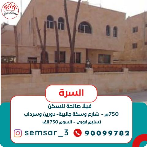 For sale, a house in Al-Surra, area 750 square meters, on a main street and a side street, consisting of two floors and a basement suitable for living, immediate delivery, price 750,000 dinars.
