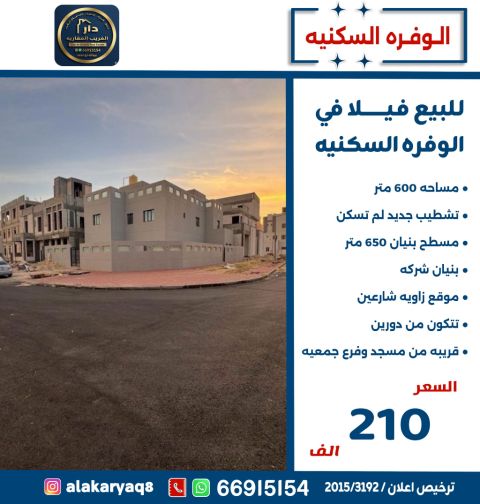للبيع: قسيمة في منطقة الوفرة السكانية، المساحة 600 متر مربع، تقع في زاوية شارعين. البيت يتكون من دورين، جديد ولم يسكن من قبل، بتشطيب سوبر ديلوكس، تسليم فوري، السعر 230 ألف.