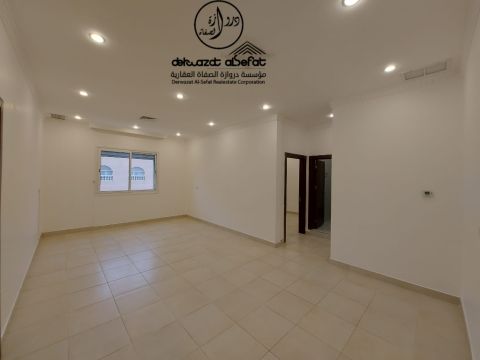 For rent: A new apartment in Al Zahra, first occupancy, 4 rooms with a balcony, first floor, new, large spaces, modern finishing, super deluxe, upscale. It consists of 4 bedrooms, including 1 master with a walk-in closet, a large living room, shutters, a large balcony, a fully equipped kitchen, a maid's room with its own bathroom and laundry area, and two shaded parking spaces. Rent: 725 Kuwaiti Dinars inclusive of water, electricity, and maintenance. For contact.