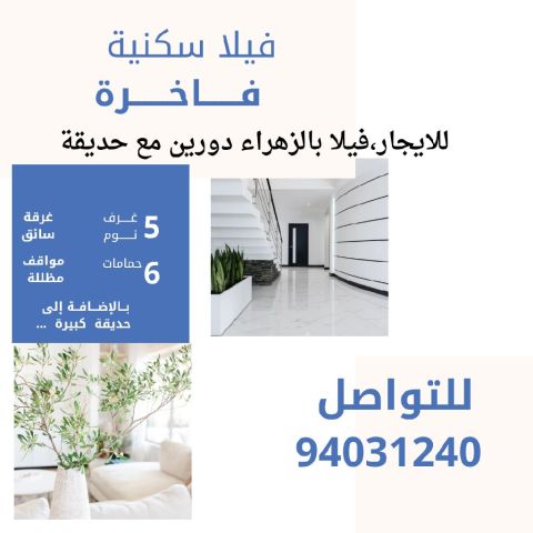 للإيجار: فيلا في الزهراء مكونة من دورين، 5 غرف نوم، 3 صالات، غرفة سائق، مطبخ رئيسي ومطبخ تحضيري، حديقة خارجية، تشطيب راقي، موقع قريب من الخدمات، مواقف مظللة. للتواصل.