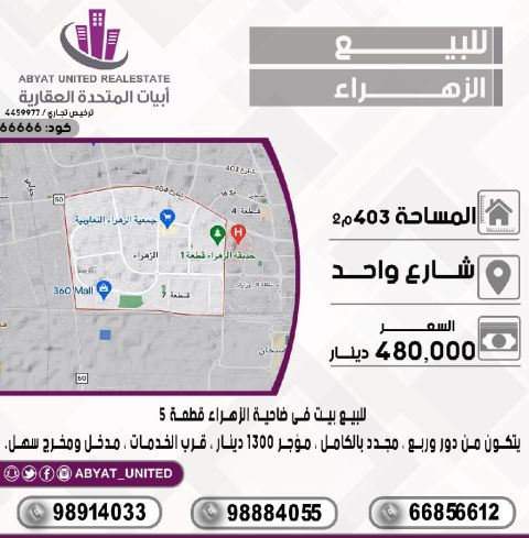 للبيع: بيت في ضاحية الزهراء، قطعة 5، يقع على شارع واحد. المساحة 403 متر مربع. يتكون من دور وربع، مجدد بالكامل، ومؤجر بمبلغ 1300 دينار. قريب من الخدمات وذو مدخل ومخرج سهل. للاستفسار، اتصل على النقال 1، النقال 2، النقال 3. السعر 480,000 دينار. الكود: 66666.