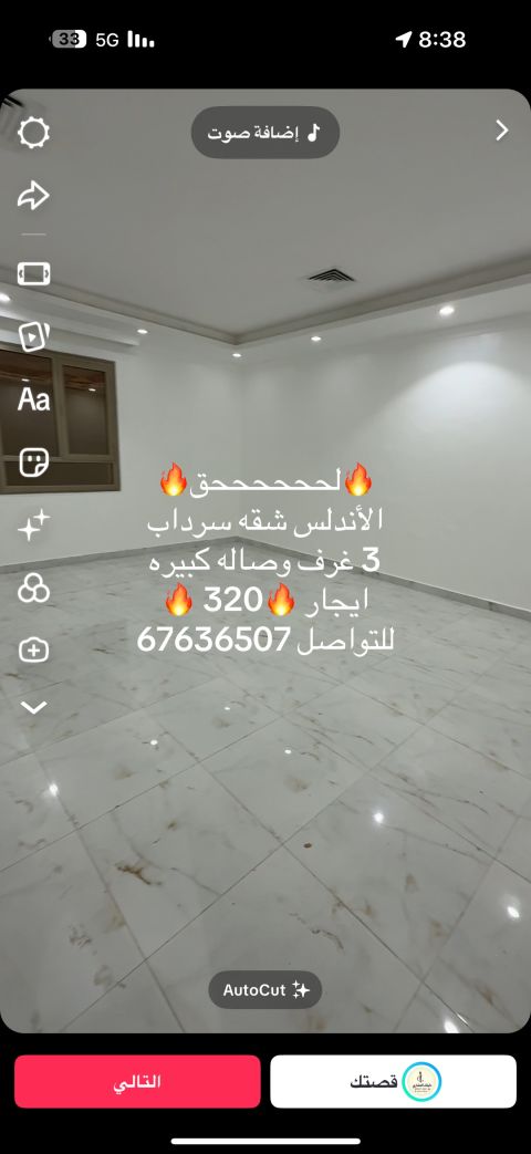 للإيجار: شقة سرداب في الأندلس، تتكون من 3 غرف وصالة وحمامين ومطبخ. الإيجار 320 دينار كويتي بالإضافة إلى عمولة نصف شهر. للمراجعة، في حالة عدم الرد، يرجى ترك رسالة.