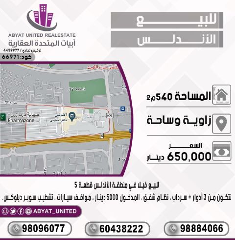 للبيع: فيلا في منطقة الأندلس، قطعة 5، موقع زاوية وساحة، المساحة 540 م²، تتكون من 3 أدوار، سرداب، نظام شقق، المدخول 5000 دينار، مواقف سيارات، تشطيب سوبر ديلوكس. للاستفسار: النقال 1، النقال 2، النقال 3. السعر: 650 ألف دينار. الكود: 66971.