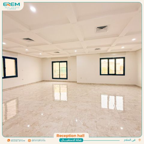 Floor for rent in "Al Salam" first with balconies, super deluxe finishing consists of a hall with guest bathroom - 4 rooms including 2 masters - kitchen - laundry room - nanny room with bathroom - shaded parking for rent KD1000 For inquiries and previews contact