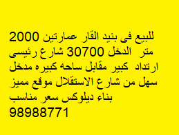 For sale in Bneid Al-Qar: two buildings, area 2000 square meters, income 30700 Kuwaiti dinars, main street, large setback opposite a large square, easy access from Al-Istiqlal Street, prime location, deluxe construction, suitable price.