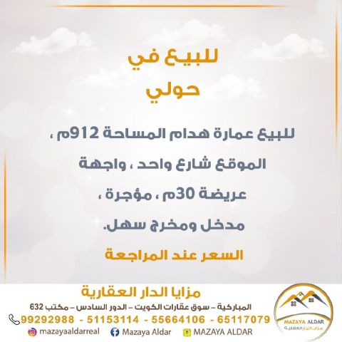 للبيع عمارة هدام في منطقة حولي، المساحة 912 متر مربع. الموقع على شارع واحد، واجهة عريضة 30 متر مؤجرة مدخل ومخرج سهل. للجادين فقط، ويمنع الوسطاء السعر عند المراجعة. للاستفسار، اتصل بالرقم النقال