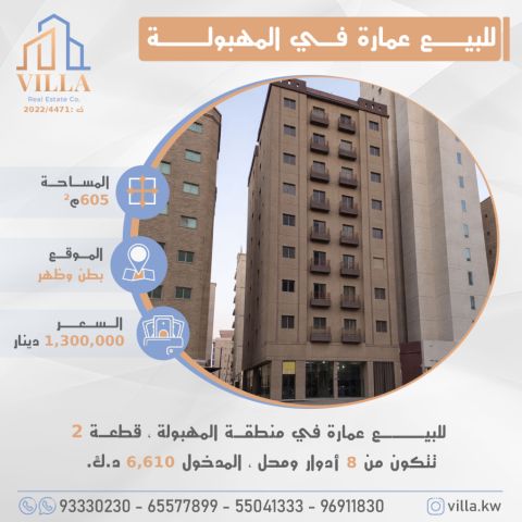 For sale: Two buildings in Salmiya. The first is on a main street with an area of 986 square meters, including a basement, ground floor, shop, 9 repeated floors, and a roof, totaling 36 apartments. Each apartment contains two bedrooms, two bathrooms, and a kitchen. The second building is on two main streets and a side street, with an area of 1001 square meters, including a basement, ground floor, shop, 8 repeated floors, and a roof, totaling 34 apartments. Each apartment contains two bedrooms, two bathrooms, a kitchen, a living room, and a maid's room. Income: 27,000 Kuwaiti dinars. Price: 5,000,000.