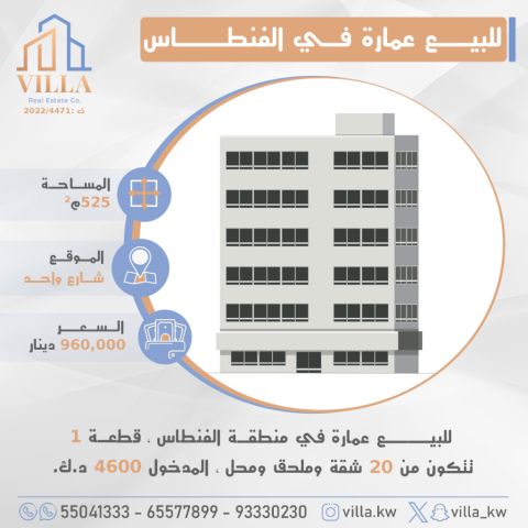 For sale: A building in the Fintas area, Plot 1, Area 525 sqm, Location: One street, Consists of 20 apartments, an annex, and a shop, Income 4600 KD, Price 960000 KD, For inquiries: Mobile 1, Mobile 2, Mobile 3