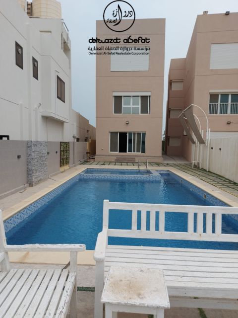 For families only. A modern chalet in Al-Khiran Park, Phase 3, directly on the creek. Newly furnished. It consists of three and a half floors with an elevator, 10 rooms all master bedrooms, 5 living rooms, and 5 equipped kitchens. It includes a swimming pool and children's play areas. Weekend rent is 550 Kuwaiti dinars. Eid holiday rent is 900 Kuwaiti dinars. There is a refundable deposit.