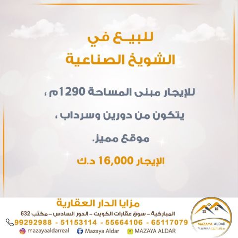 For rent A building in the Shuwaikh Industrial Area with an area of 1290 SQM, consisting of two floors and a basement, in a prime location. For serious inquiries only, no brokers allowed. rent is 16000 dinars. For inquiries, contact via