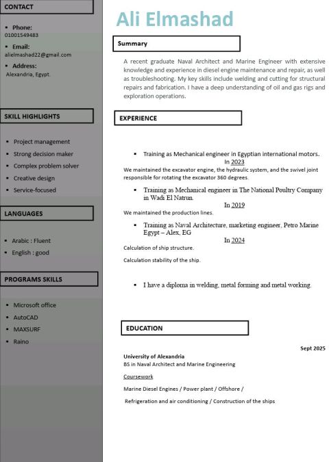I am a marine mechanical engineer with extensive experience in designing tourist yachts and Nile cruise ships. I possess strong technical expertise in marine mechanical systems used in floating units, in addition to significant practical experience in operating and maintaining main propulsion systems.