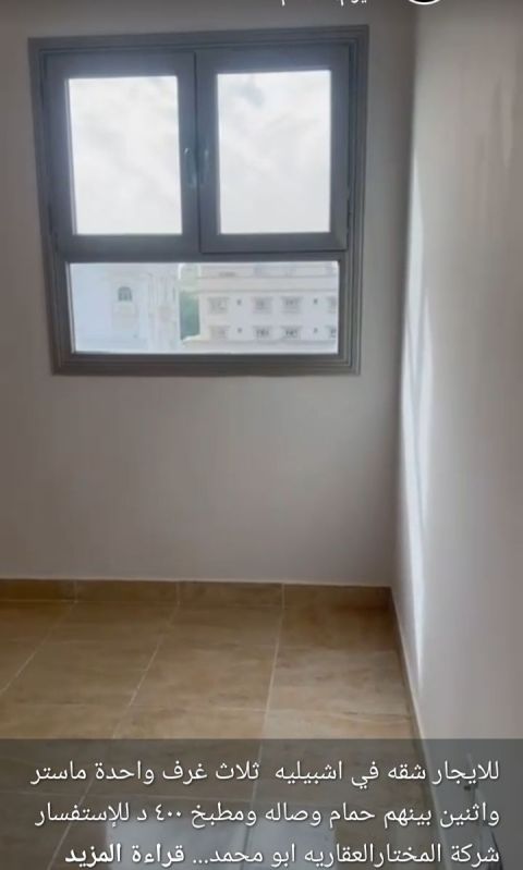 For rent: An apartment in Ashbelia with three rooms, one master bedroom and two rooms with a bathroom between them, a hall, and a kitchen. For inquiries, contact Al-Mukhtar Real Estate Company, Abu Muhammad.