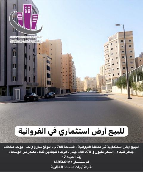 للبيع: أرض استثمارية في منطقة الفروانية، مساحتها 760 متر مربع. الموقع على شارع واحد، ويوجد مخطط جاهز للبناء. السعر مليون و270 ألف دينار كويتي. للجادين فقط، نعتذر من الوسطاء. رقم الكود 17. للاستفسار: ترخيص تجاري / 4459977، شركة أبيات المتحدة العقارية.