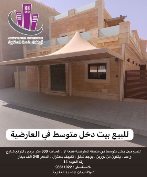 For sale: A medium-sized house in the Al-Ardiya area, Plot 3. Area: 600 square meters. Location: One street. Consists of two floors. Includes apartments. Central air conditioning. Price: 340,000 dinars. Code number: 14. For inquiries: United Abiyat Real Estate Company.