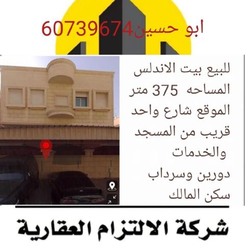للبيع: بيت الأندلس، المساحة 375 متر مربع، يقع على شارع واحد قريب من المسجد والخدمات، دورين وسرداب، سكن المالك.