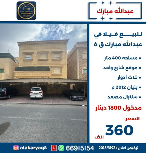 For sale: A plot in Seville, Q1, front and back facing the school wall. Behind it is a three-and-a-half-story island. The ground floor includes a diwaniya (reception area), two halls, a kitchen, two bedrooms, and a storage room. The first floor has six rooms, two of which are master bedrooms with dressing rooms. The second floor has two apartments, each with three rooms, a hall, and a kitchen. The roof has a ground-floor apartment and a first-floor residence for the owner, plus three rented apartments. There are two staircases, an elevator, and central air conditioning. Price: 450,000 (Location Real Estate Agency).