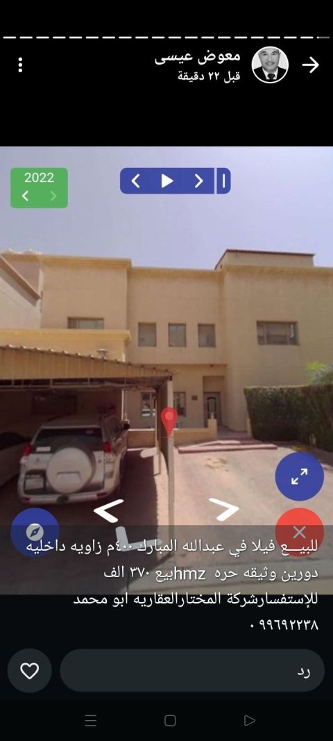 For sale, a villa in Abdullah Al-Mubarak Al-Sabah, area 400 square meters, internal corner, two floors, freehold document, price 370 thousand Kuwaiti dinars. For inquiries, Al-Mukhtar Real Estate Company, Abu Muhammad.