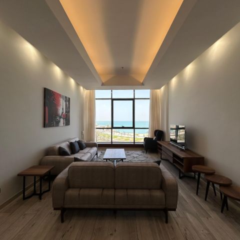 Apartments directly on the beach in Dasman, Kuwait City, for rent. One-bedroom apartments, with options: a) furnished, b) semi-furnished (one bedroom or two bedrooms). There are two swimming pools, a gym, security, cleaning three times a week, and underground parking for one car. The price starts from 600 Kuwaiti dinars for the semi-furnished double room, and the price starts from 700 Kuwaiti dinars for the semi-furnished apartment. Broker fee is half a month's rent.