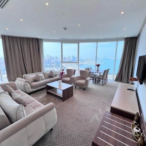 A furnished apartment for rent in East Piece 3, a prime location with a sea view, super deluxe finishing, consisting of a hall, room, kitchen, bathroom, surveillance cameras, security, swimming pool, gym, lobby, billiards, tennis table, internet, car parking, cleaning service, including water, electricity, and maintenance. Rent starts from 800 KD per month, security deposit + company commission.