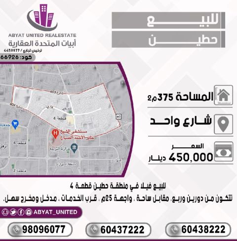 For sale: A villa in the Hitteen area, plot 4. Location: one street, area 375 square meters, consisting of two and a quarter floors, opposite a square, frontage 25 meters, easy entrance and exit, near services. For inquiries: Mobile 1, Mobile 2, Mobile 3. Price: 450 thousand dinars. Code: 66926.