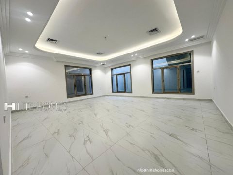 For rent, an apartment with a balcony in West Mushrif, first floor with elevator, excellent spaces, curtains, central heating, 3 bedrooms including a master bedroom 5*6m, living room, 3 bathrooms, maid's room, equipped kitchen, central air conditioning, ceramic tiles, parking available, for rent 550 Kuwaiti dinars.