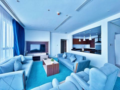 A fully furnished apartment, first occupant, for rent in Hawally Square. New building, first occupant. Very prime location close to all services, easy entrance and exit, sea view, super deluxe finishing. Consists of a hall, kitchen, 3 bedrooms (one master bedroom), total 2 bathrooms. The building includes a reception lobby, gym, surveillance cameras, central air conditioning, internet, underground parking. Includes water, electricity, and air conditioning maintenance. Rent starts from 600 KD, security deposit half rent.