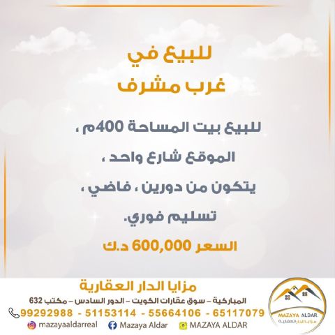 للبيع: بيت في منطقة غرب مشرف، بمساحة 400 متر مربع. الموقع على شارع واحد، يتكون من دورين، فاضي، مع تسليم فوري. للجادين فقط، ويمنع الوسطاء. السعر 600 ألف دينار. للاستفسار، اتصل على الرقم النقال.