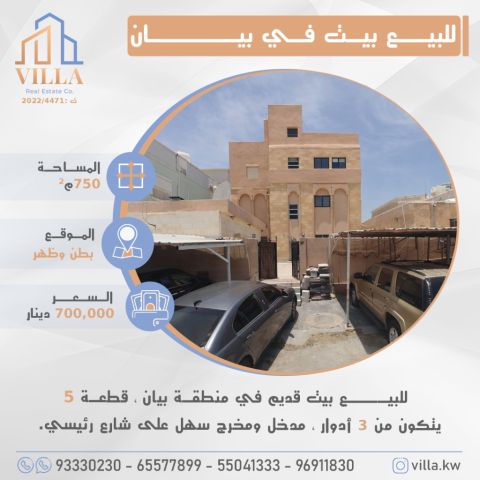For sale, a villa in Al Zahra, Plot 2, Street 206m 8, Parcel 453. Area: 375 square meters, one street, frontage 25 meters. Ground floor: a diwaniya with its bathroom, a master bedroom with 2 bathrooms, a dining room with a bathroom, a guest room and bathroom, and laundry rooms. First floor: 4 master bedrooms, a large room that can be used as a hall and salon, a preparation kitchen, 3 balconies, a quarter laundry room, and a domestic worker's room. The first floor can be suitable for rent. Price: 500,000 KWD direct. License number: 22670/2024.