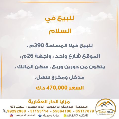For sale: A house in Al Zahra, with a prime location, area of 500 square meters, consisting of three separate floors. The ground floor includes three living rooms, an external diwaniya, a bedroom, a kitchen, and a storage room. The first floor has three large bedrooms, a kitchen, and a maid's room. The second floor is the same as the first, with three large bedrooms, a maid's room, a kitchen, a laundry room, and a roof. There is a room with a bathroom in the courtyard and a large garage. An elevator runs from the ground floor to the roof, and central air conditioning is installed. The owner is residing in the property. Price: 600,000 KWD. Real estate agency: Lukeesh Real Estate.