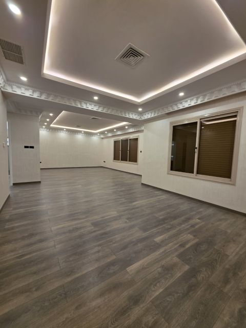 For rent: A house in Bayan, Q8, with an area of 300 square meters, located on a single street, fully renovated in 2025. It consists of a ground floor, first floor, and a quarter floor. The ground floor includes a courtyard, three halls with their own laundry rooms, a separate diwaniya with its laundry room, a kitchen, and a driver's room with an external bathroom. The first floor includes two halls, a master bedroom, four rooms, and two external bathrooms. The second floor includes a master bedroom for domestic workers. The roof includes a machinery room and a laundry room. Rent: 1400 Kuwaiti Dinars.