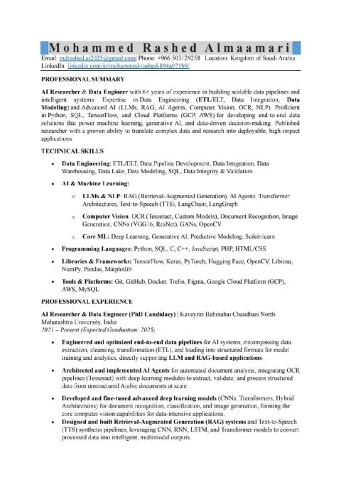 Specialist in artificial intelligence with over 6 years of experience in generative AI, intelligent agents, machine learning, and deep learning. Proficient in convolutional neural networks (CNN), transformers, generative adversarial networks (GAN), and large language models (LLMs) for text and image processing, optical character recognition (OCR), and text-to-speech (TTS) conversion, with distinguished experience in Arabic script processing and cloud deployment.