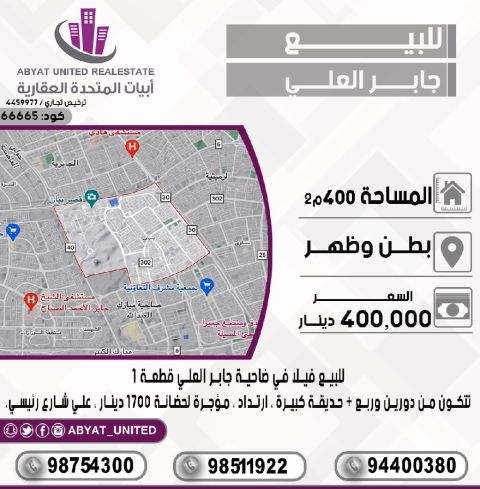 For sale: A villa in Jaber Al-Ali suburb, Plot 1, with front and back access. The area is 400 square meters, consisting of two and a quarter floors, a large garden, and a setback. It is rented to a nursery for 1700 dinars, located on a main street. For inquiries, call Mobile 1, Mobile 2, or Mobile 3. The price is 400,000 dinars. Code: 66665.