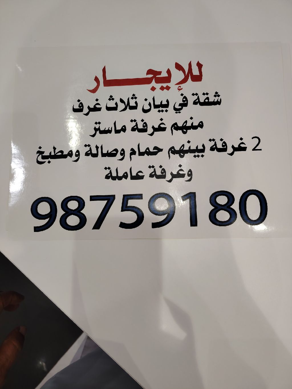 للإيجار: شقة في بيان، قطعة 9، بثلاث غرف منها غرفة ماستر، وغرفتين بينهما حمام، وصالة، وغرفة خادمة مع حمام، وتكييف واحد، ومطبخ، ومواقف سيارات. الإيجار الشهري 350 دينار كويتي.