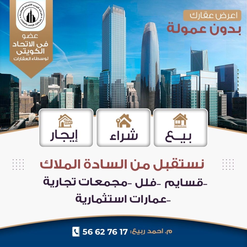 للبيع: مجمع تجاري مميز في الجهراء. موقع استراتيجي وحيوي جداً يخدم مختلف الأنشطة التجارية. المساحة: 1537 متر مربع. مؤجر بالكامل (مكاتب + محلات). الدخل الشهري الحالي: 38,000 دينار كويتي، قابل للزيادة. شهادة الأوصاف جاهزة. أشغال كاملة بدخل ثابت.