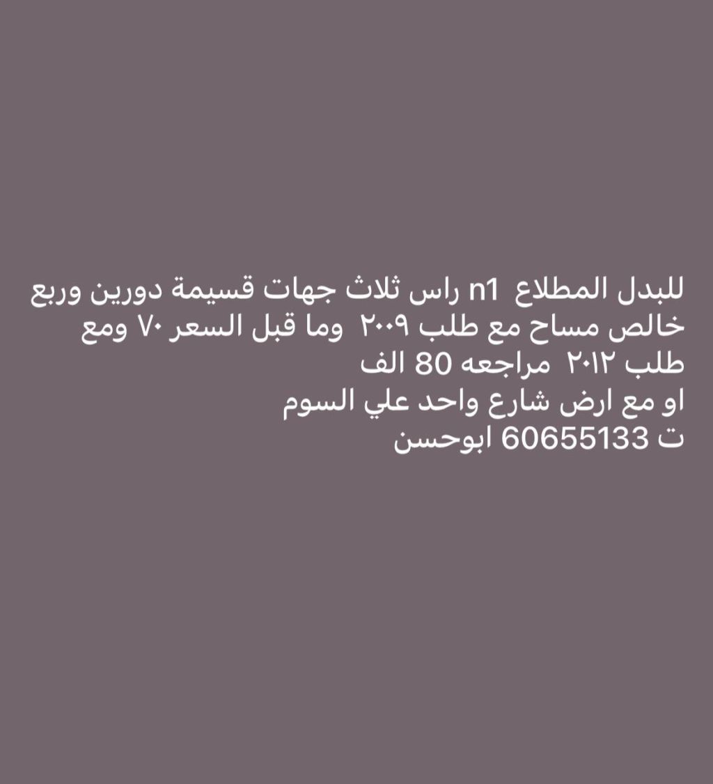 For exchange in Al-Mutlaa N1, a three-sided corner plot with a two-and-a-quarter story building, fully paid, with a 2009 or older car requested, price 70,000; with a 2012 car requested, price 80,000; or with a one-street land, negotiable. Contact Abu Hassan.