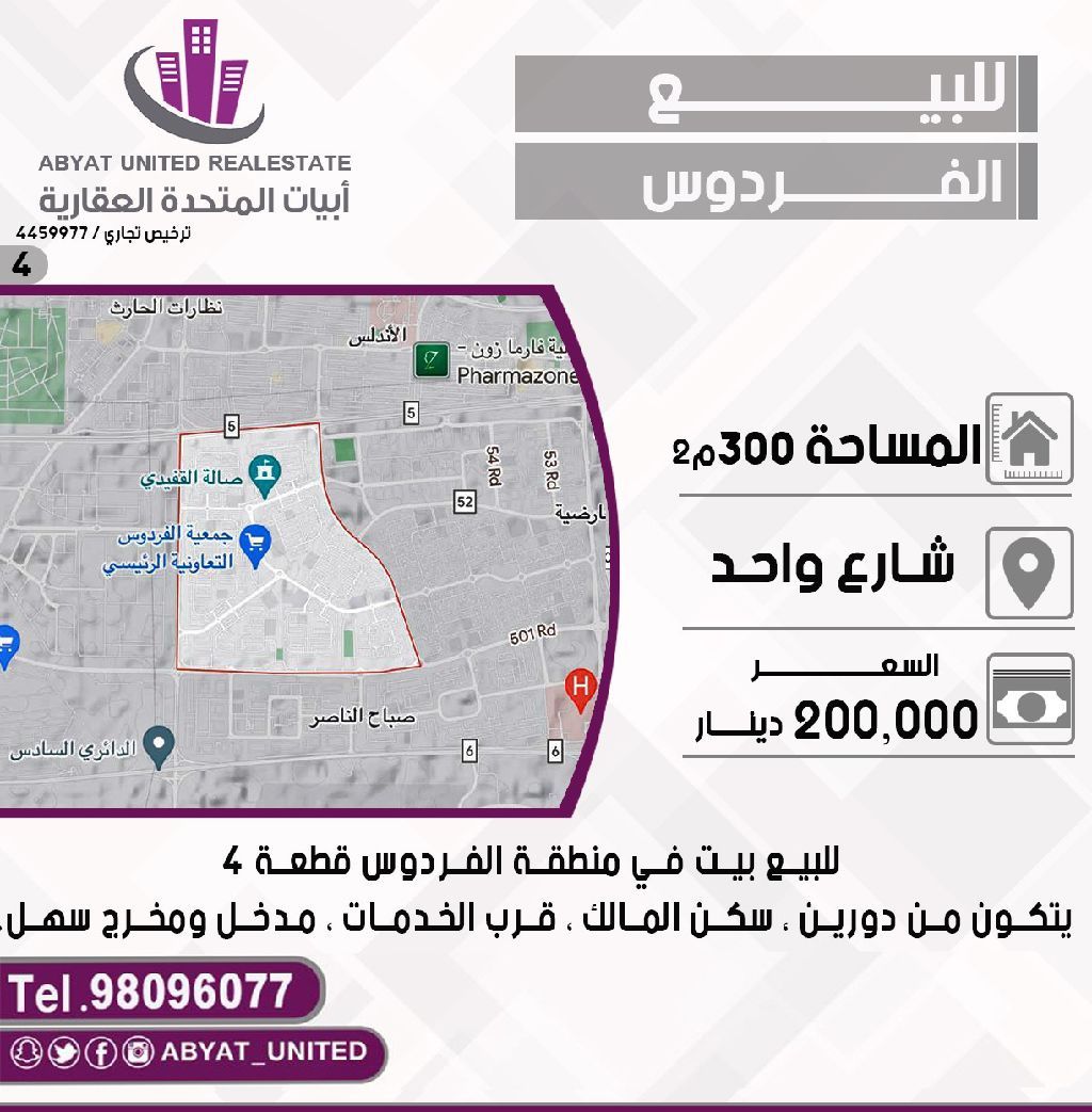 للبيع: بيت في منطقة الفردوس، قطعة 4، يقع على شارع واحد. المساحة: 300 متر مربع، يتكون من دورين، سكن المالك، قرب الخدمات، مدخل ومخرج سهل. للاستفسار، النقال: 1، السعر: 200 ألف دينار، الكود: 4.