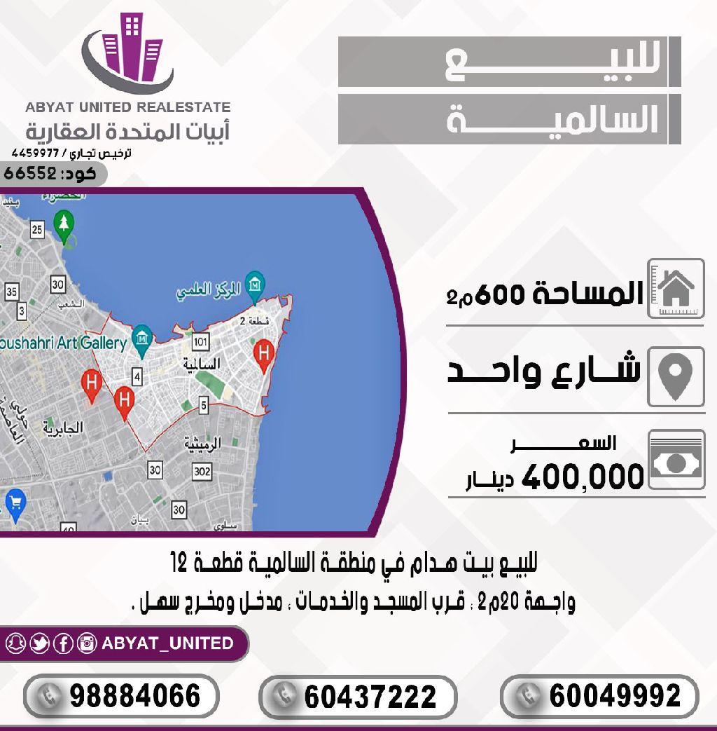 For sale: A house in the Salmiya area, Plot 12. Location: One street. Area: 600 sqm. Frontage: 250m. Near the mosque and services. Easy access and exit. For inquiries, Mobile 1, Mobile 2, Mobile 3. Price: 400,000 dinars. Code: 66552.