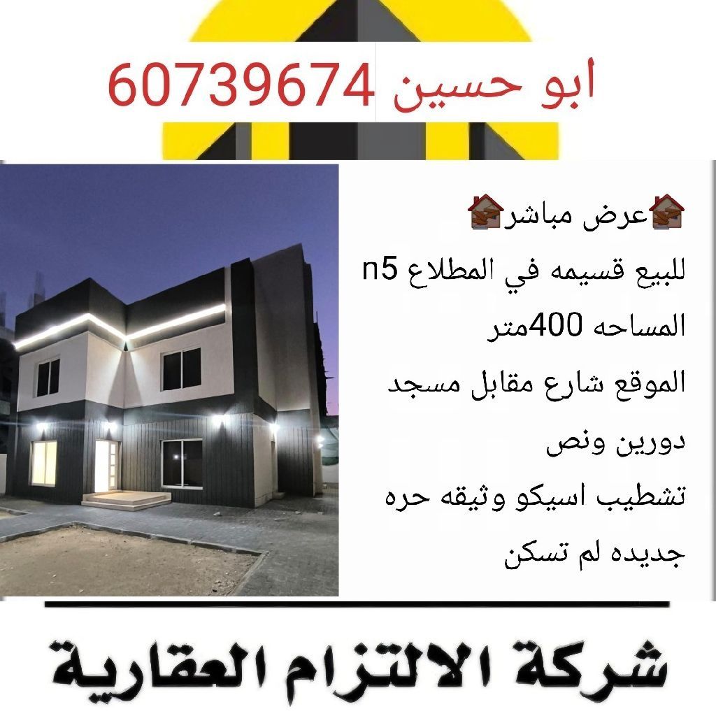 عرض مباشر للبيع: قسيمة في المطلاع N5، المساحة 400 متر، الموقع على شارع مقابل مسجد، دورين ونصف، تشطيب أسيكو، وثيقة حرة جديدة، لم تسكن.