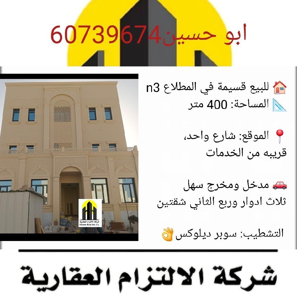 For sale, a plot in Al-Mutlaa N3, area 400 meters. Location: one street, close to services, easy entrance and exit, and a distinguished location. Three and a quarter floors, the second floor has two apartments. Finishing: super deluxe.