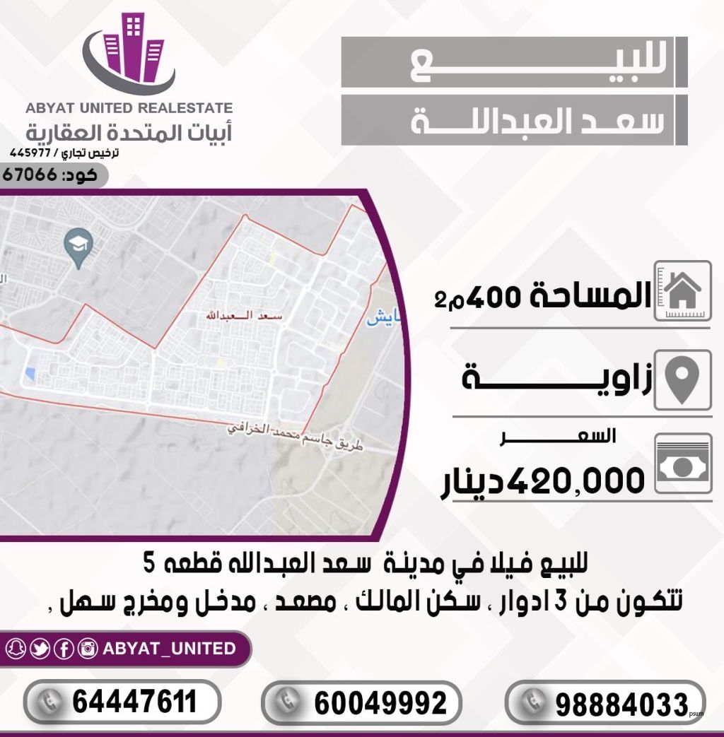 For sale: A villa in Saad Al-Abdullah City, Plot 5. Area: 400 square meters. Corner location. Consists of 3 floors. Owner-occupied. Elevator. Easy access entrance and exit. For inquiries, Mobile 1, Mobile 2, Mobile 3. Price: 420,000 dinars. Code number: 67066.