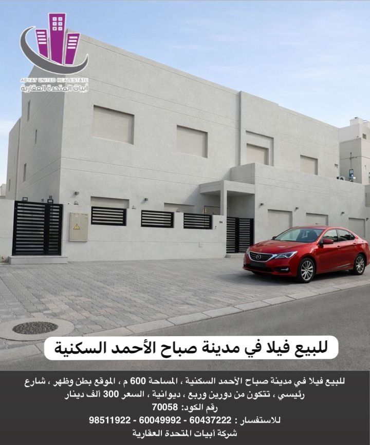 For sale: A villa in Sabah Al-Ahmad Residential City, area 600 sqm, location with front and back access, main street, consisting of two and a quarter floors, a diwaniya, price 300,000 dinars. For serious inquiries only, code number 70058 for inquiries - United Abiyat Real Estate Company.