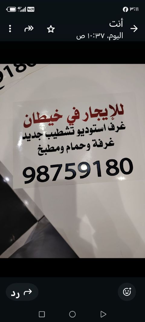For rent in Khaitan, new finishing, never lived in before. One room, one bathroom, and a new kitchen. Ground floor with a door opening to the street. Rent is 220 KD.