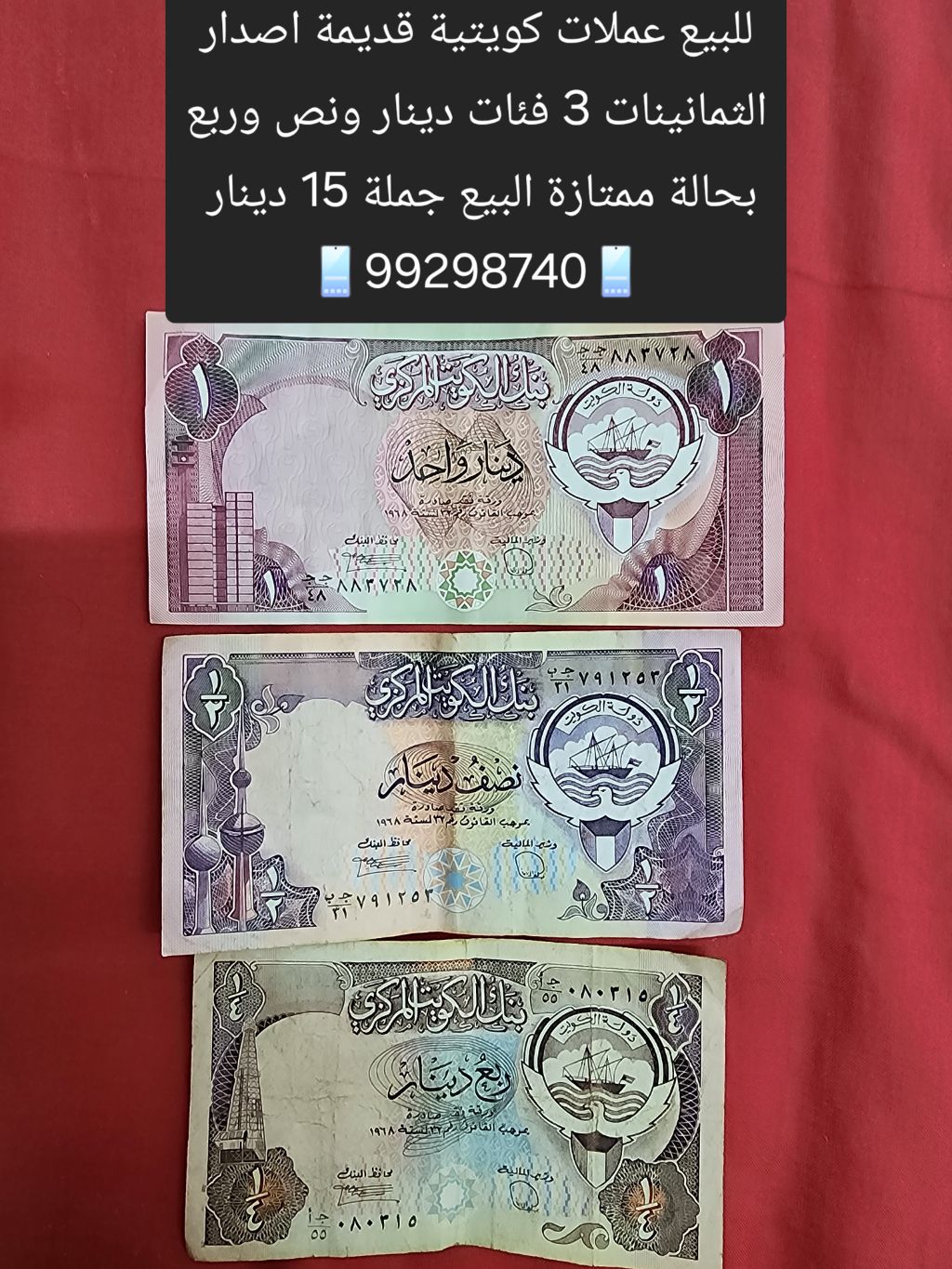 للبيع عملات كويتية قديمة اصدار الثمانينات، 3 فئات: دينار ونصف دينار وربع دينار، بحالة ممتازة. البيع جملة بسعر 15 دينار.