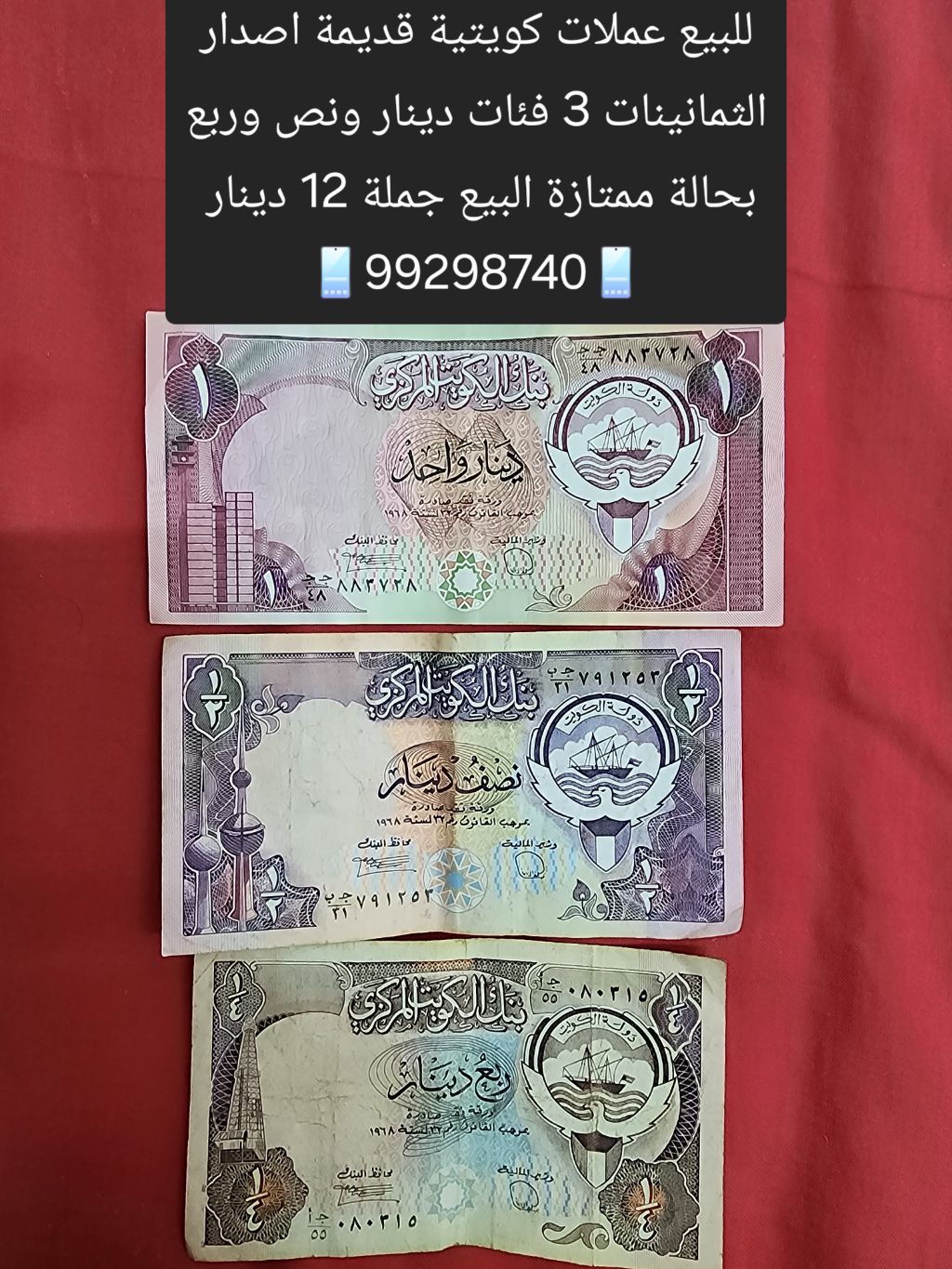 للبيع عملات كويتية قديمة اصدار الثمانينات، 3 فئات دينار ونصف دينار وربع دينار، بحالة ممتازة. البيع جملة بسعر 12 دينار