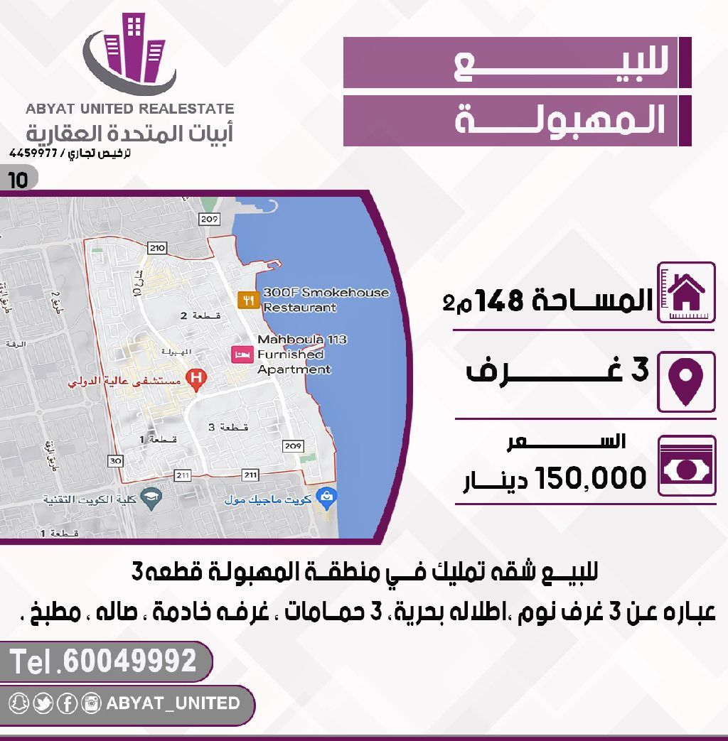 For sale: A freehold apartment in the Al-Mahboula area, Block 3, with an area of 148 square meters. It consists of 3 bedrooms, a sea view, 3 bathrooms, a maid's room, a living room, and a kitchen. For inquiries, call mobile number 1. Price: 150,000 Kuwaiti Dinars, Code 10.