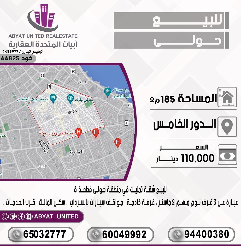 For sale: A privately owned apartment in Hawally, Block 6, 5th floor. Area: 185 m². It consists of 3 bedrooms, including 2 master bedrooms, a maid's room, car parking in the basement, owner-occupied, close to services. For inquiries, Mobile 1, Mobile 2, Mobile 3. Price: 110,000 Kuwaiti Dinars. Code: 66825.