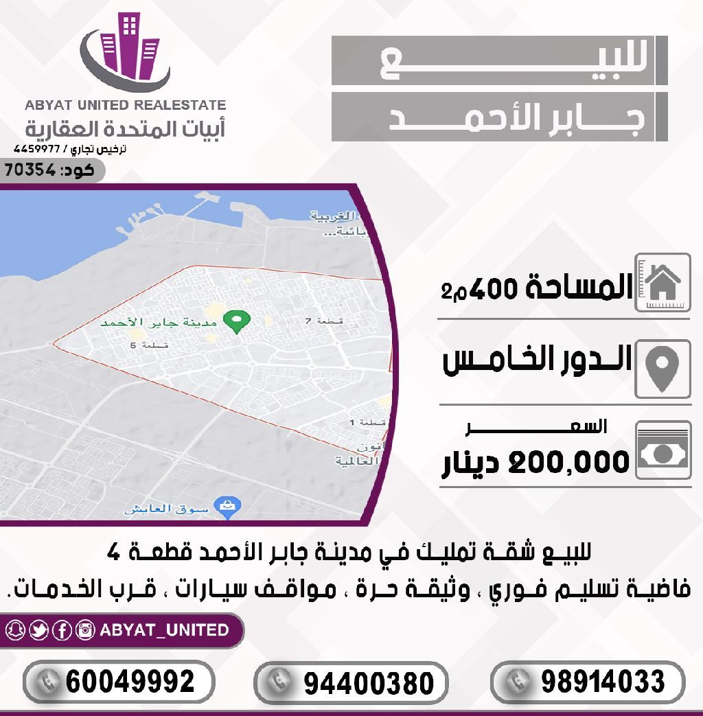 For sale: A freehold apartment in Jaber Al-Ahmad City, Plot 4, 5th floor. Area: 400m, vacant, immediate delivery. Freehold document, car parking, easy access. For inquiries, mobile numbers: 1, 2, 3. Price: 200,000 dinars. Code: 70354.