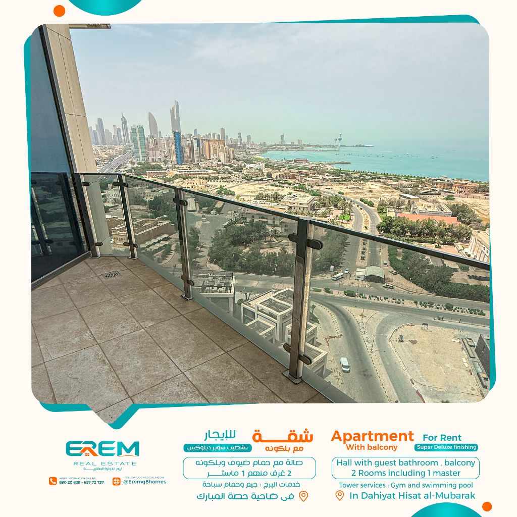 للإيجار في ضاحية حصة المبارك، برج سكني، شقة أول ساكن، تشطيب سوبر ديلوكس. تتكون من صالة مع بلكونه - حمام ضيوف - غرفتين منها واحدة ماستر - مطبخ مجهز - غرفة مربية مع حمام - مواقف مظللة. للإيجار من 850 الى 1000 دينار كويتي. خدمات البرج تشمل جيم وحمام سباحة