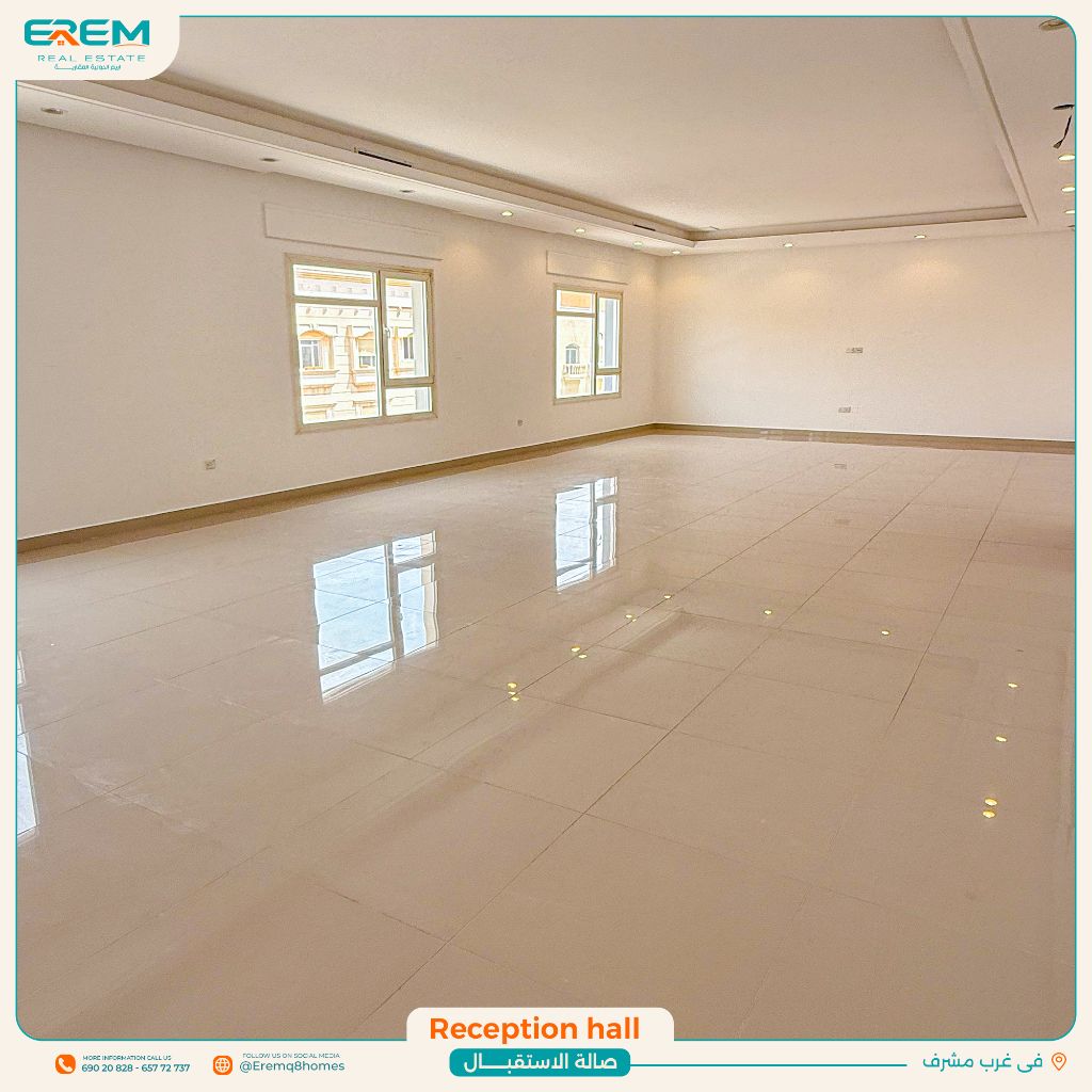 للإيجار في غرب مشرف، دور كامل بتشطيب سوبر ديلوكس، يتكون من صالة مع حمام ضيوف، 4 غرف منهم 2 ماستر، مطبخ، غرفة مربية مع حمام، ومواقف مظللة. للإيجار بمبلغ 1000 دينار كويتي. للاستفسار والمعاينة